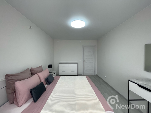 - Спальня оборудована двухспальной кроватью, комодом, трюмо с зеркалом, двумя тумбами с дополнительным освещением;